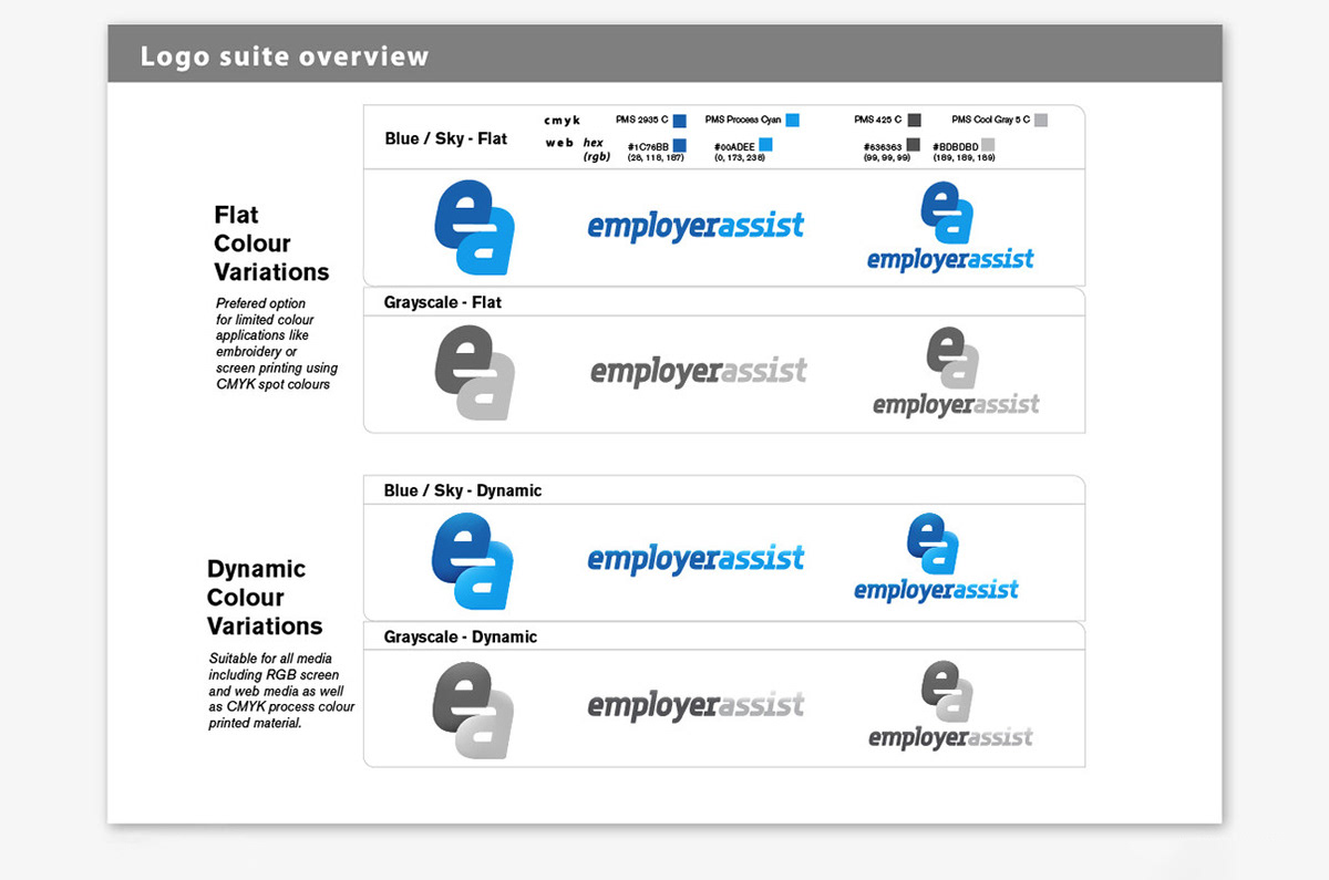 Logo suite designed for industrial relations company Employer Assist, inclusive of abbreviated monogram icon logo and full type logo as well as lock up prepared in colour variations. Colour values provided for print and digital usage.