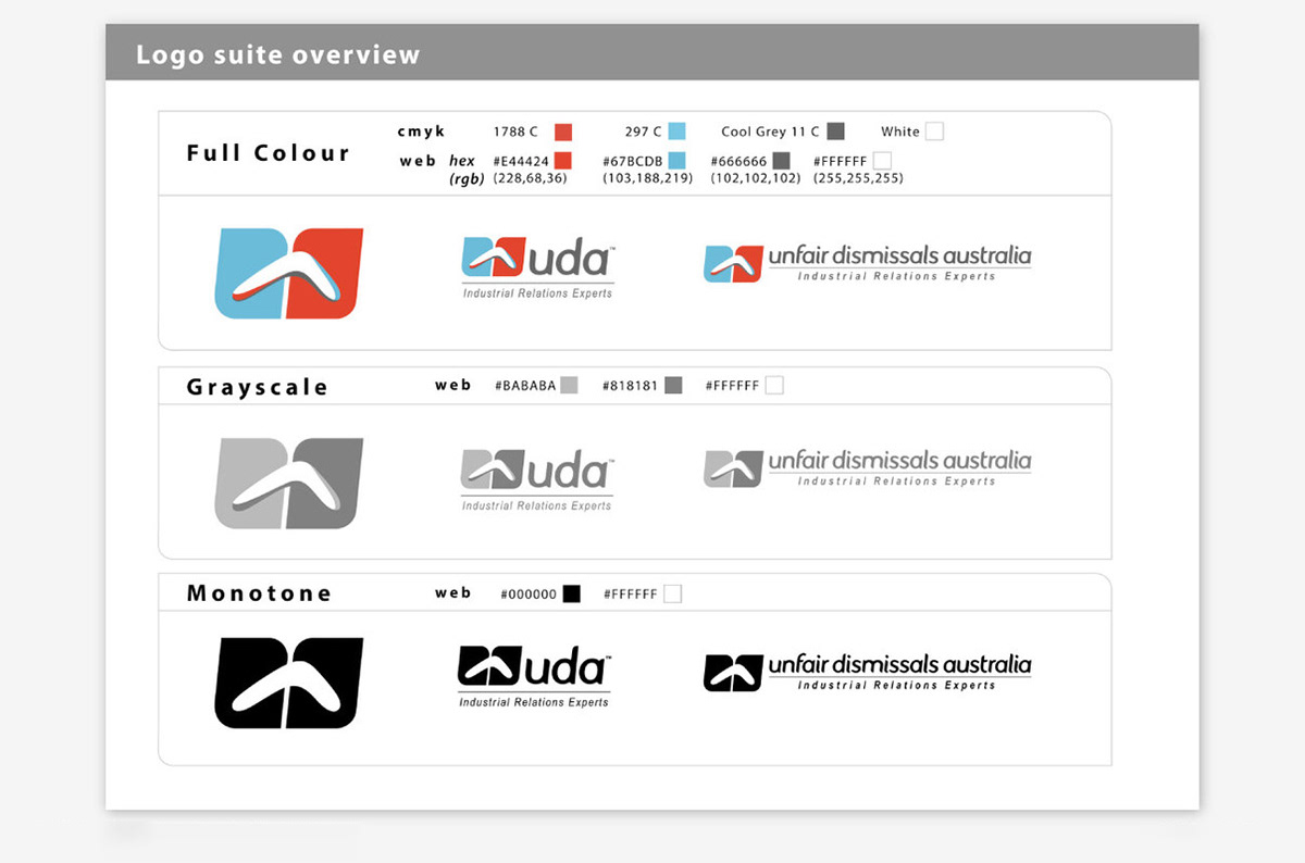 Logo suite designed for industrial relations company Unfair Dismissals Australia, inclusive of monogram icon logo and full type logo as well as lock up prepared in colour variations. Colour values provided for print and digital usage.