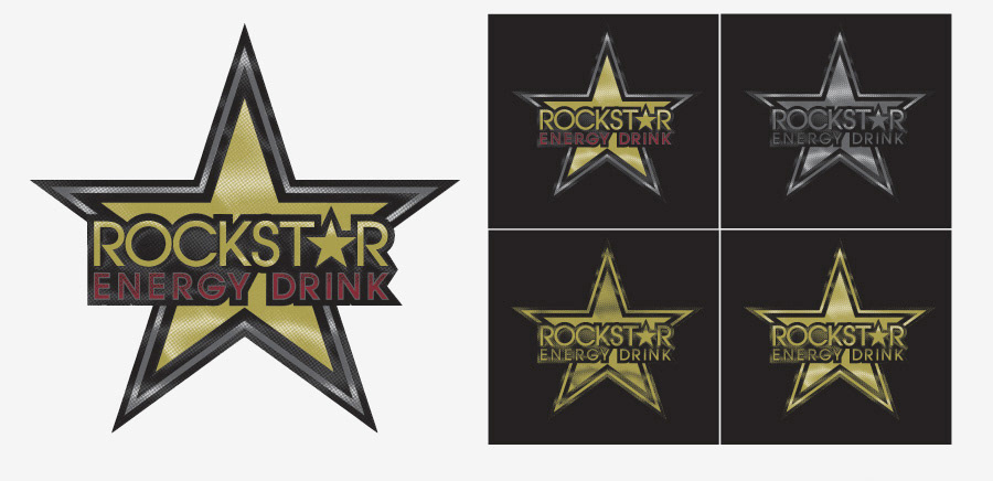 Variations on the core logo for Rockstar Energy Drink apparel & accessories. Halftone vector colour separations applied to the core logo, prepared for 1, 2, 3, 4 and 5 colour print applications.