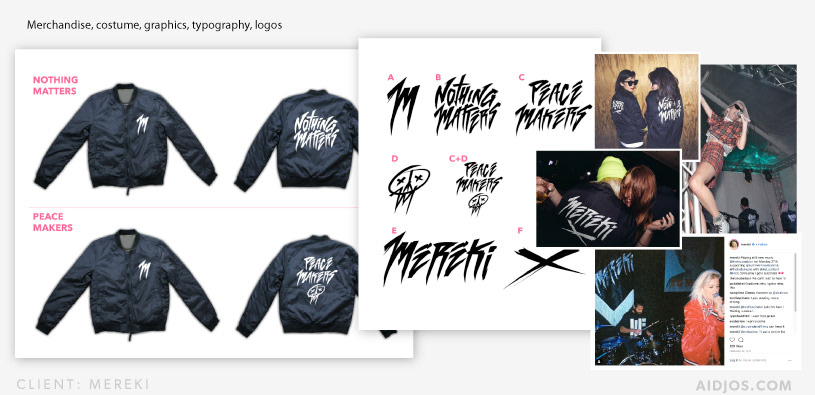 I prepared custom jackets for singer song writer Mereki for her Nothing Matters release. With feedback from the singer, I prepared various type based and pictorial concepts which she then used on back drops and jackets for her dancers as part of her live performances.
